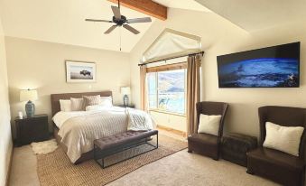 The expansive primary bedroom encompasses the entire second floor enjoying a quiet, private oasis, boasting a king bed with luxurious Frette linens, large east-facing picture window, walk-in closet, 60" flat screen, smart TV and en suite spacious master bath. You will love our spa inspired jetted tub that soaks away the day's adventures, large walk-in shower, double vanity and private water closet.