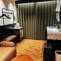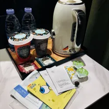 La camera ha un piccolo frigorifero con tè nero freddo e cola. I tè gratuiti includono acqua minerale e bustine di tè verde e nero. Offrono anche una maschera viso Pechoin, una maschera viso compressa e una crema mani.