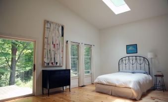 The house has skylights throughout, 2 bathrooms and 4 bedrooms. The master bedroom has a queen-sized bed and en suite bathroom with a very large claw foot tub and walls of local pine; there is also a private deck attached to this bedroom. Another bedroom has a queen-sized bed with a wood burning stove and a deck as well. The third bedroom has a queen bed and bunk bed and is equipped with toys and games for the kids.The smallest bedroom has a full sized bed. The house is perfect for a large group of people.