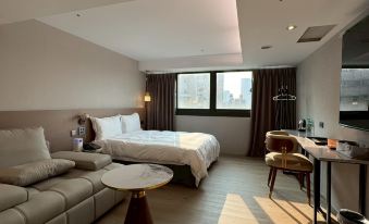 連假當天臨時才找的房間,還在試營運的樣子,房間都還很新還有施工劃的記號未抺去,沙發床超大,超適合青少年,電視也超級大。