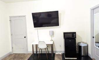 Luxurious master bedroom with Self check-in, king size bed, spacious bathroom, 55'' TV 4K (Netflix Available), mini fridge, and a microwave.