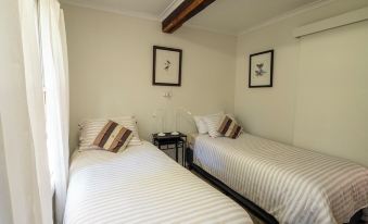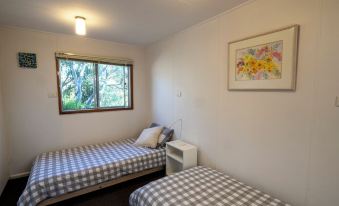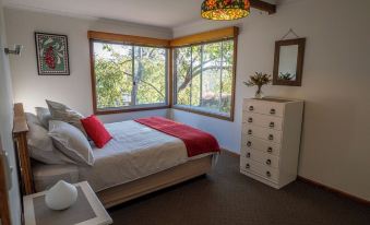 The main cottage is cosy with 2 bedrooms - a queen bed in the large bedroom and two single beds (or combined to a King bed). The kitchen, lounge room and dining area are the open plan hub of the house with a cosy wood fire for cooler months and an optional reverse cycle air conditioner. The bathroom has a bath/ shower, with a separate toilet.