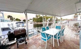 And if you're in the mood for a barbecue, fire up the smoker-BBQ grill. Our backyard includes sinks and stovetops for easy meal preparation, as well as storage coolers for your convenience. Sit back and relax in our rocking chairs or dining chairs, enjoying the charming atmosphere of the Florida Keys.
