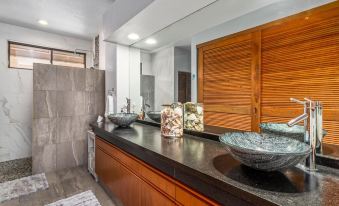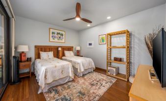 The Master bedroom has lovely, inspired decor with a king-size bed and a master ensuite bathroom. The bright and colorful Guest bedroom has 2 single beds that can be converted to a king, and a detached guest bathroom with a glass shower. Both bedrooms have flat-screen televisions for your viewing pleasure.