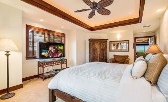 On the second floor, the spacious master bedroom is furnished with a California king sized bed, walk-in closet with built in cabinets, a large En-suite bathroom with double sinks, soaking tub and shower. There is also a flat screen TV with cable access and a comfortably furnished private lanai. One of the two downstairs bedrooms is furnished with a queen bed, En-suite bathroom with double sinks, soaking tub and shower, large closet and flat screen TV with cable access.