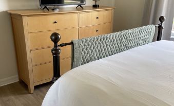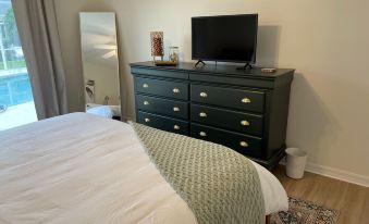 The King Bed Master Bedroom has access to the pool and large walk-in closet with ensuite bathroom that includes an extra large shower and double sinks. The second King Bedroom also has access to the pool and a full bathroom with bathtub just outside of the room which is a shared bath with the Queen bedroom. All bedrooms have premium bedding, 42" TV's and black out curtains.