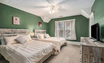 Ideal for family gatherings or large groups, our home invites you into its two charming living rooms, each brimming with a stylish vintage allure. Sink into the plush sectional couch, pull out the sofa bed if needed, and enjoy a film on the 58” smart HDTV, creating a perfect setting for memorable, cozy movie nights.