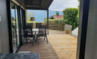 Check in war unproblematisch. Das Haus selbst befindet sich innerhalb der Bungalowanlage relativ weit oben und damit in ruhiger Lage. Ohne eignen PKW wahrscheinlich eher schwierig zu erreichen. Das Haus hat ein sehr schönes Wohnzimmer mit gutem Ausblick . Auch die Terrasse , die L-förmig um das Haus geht ist sehr schön mit Ausblick auf die Berge und den See. Die Terrasse ist auch wesentlich größer als auf dem Bild zu erkennen. Küche hat alles was man braucht, generell ist die Ausstattung im haus sehr gut. Fernseher, Radio und Internet sind vorhanden und können genutzt werden ( die deutschen sender findet man ab Platz 101 ). Das Bad ist klein , wir wearen nur zu zweit , da war das kein Problem. Die drei Schlafzimmer sind leider sehr klein und einfach ausgestattet. Für 6 Erwachsene würde ich das nur empfehlen, wenn die Ansprüche ans Schlafzimmer gering sind, wir waren nur zu zweit. Möbel für die Terrasse sind im angenzenden Schuppen ausreichend vorhanden. Die komplette Anlage liegt oben am Berg, daher hat man natürlich jeden Tag ca. 10 - 15 Minuten um runter an die Strasse zum See zu kommen - dafür hat man aber auch eine herrlich ruhige Lage. Schiebetür ließ sich nur schwer öffnen. Das haus selbst ist eines der größeren in der Anlage. Fazit: Für 6 Personen nur wenn man wirklich keine Ansprüche an die Schlafräume stellt und mit einer Dusche Toilette klar kommt. Dafür tolle Lage von Haus , auch in der Anlage selbst , mit wunderbaren Ausblick und Stellplatz direkt am Haus.