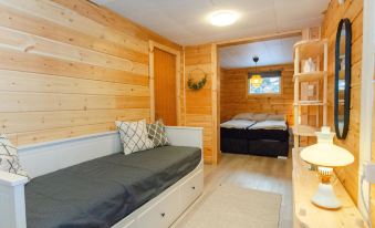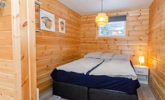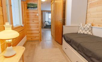 Holiday cabin, built in 1965 and fully renovated in 2023. The living room and bedroom both feature pull-out sofa beds, with an additional double bed in the bedroom alcove. Access from the bedroom to the bathroom and sauna, which has a wood-burning sauna stove. Terrace.