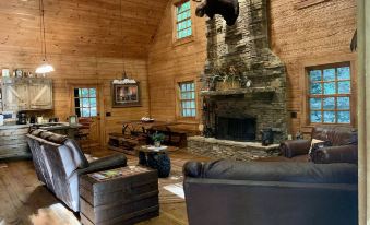 - The large open living area with high ceilings and rustic flooring boasts a massive wood burning fireplace and smart TV to allow you the ability to connect to your favorite apps. Our cabin is remote, Wi-Fi connection can be spotty sometimes. We will not provide refunds for interrupted internet connection.