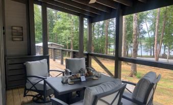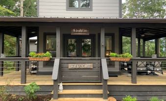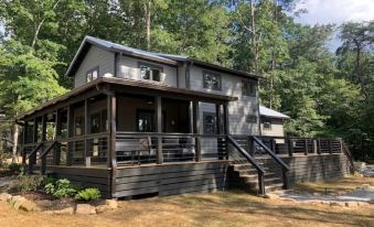 Spacious serene getaway nestled in the beautiful Tiny Home mountain community of Waters Edge. Sitting next to the lake, our home is a larger version of a "Tiny Home" with 3 large rooms to sleep (king/ Queen/ 2 Twins), 2 full baths, a full kitchen & living room with "WOW" water views! There are Outdoor areas: Covered decks, grill & PUB (PUP) Shed! Play games, sit by the fire pit, enjoy a drink in the pub/pup shed or just enjoy the lake view! Please see SPACE description for DOG rules. This "Tiny Home" is fit for a family or couples to not be cramped in a small space, but to enjoy this wonderful community in a beautiful lake setting. This spacious home has a king bedroom with full bath, a queen bedroom with full bath across the hallway and a very large "stand up" loft with 2 twin beds up a nice stairway. The kitchen is a chefs dream and fully stocked with anything you would need. There is a large island for eating/socializing, ample counter space for cooking, a coffee bar, & a "Bar space" for mixing drinks. The gorgeous living room is connected to the Kitchen with amazing water views all around & a large TV. Open the French doors to incredible outdoor living space under a covered porch with chat table fire pit. There is a huge side porch with a grill & wide open to Lake views. This is a great place to catch some sunshine & read a book! Just off the deck is a winding path back to the PUP/PUB Shed This Shed is another hangout spot to watch a game on TV, have a drink, play games or just enjoy the lake view. There is an exterior "Real Wood" Fire Pit area for times when you want to sit under the trees & stars in a woodsy atmosphere. The community path behind our home is a hop skip and jump to the lake and Kayak rental area.