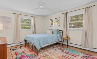 The second floor has three bedrooms and one full bathroom with tub. The main bedroom has a queen bed, large dresser, side chair, ceiling fan with LED lighting and two spacious closets.