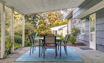 The main living space features a newly renovated kitchen, open to the dining area and living room with fireplace. The breakfast bar has four stools for extra dining space. The dining room has seating for 4 and French doors leading to the spacious back yard and outdoor patio, with Adirondack chairs and a fire pit. Enjoy outdoor dining at the table for 6 located on a covered patio with ambient patio lighting.