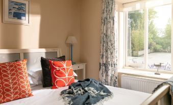 Bramblings sleeps up to two adults with its spacious, en-suite bedroom with a king-size sleigh-bed with crisp white linen, and a dedicated workspace. With views of the courtyard and trees that surround the barn, this is an airy and luxurious space to relax in after a day spent exploring Cornwall. We can also cater for babies; with cots, toys, and baby baths available. The large ensuite bathroom boasts double sinks, a roll-top bath, and a walk-in shower. Fluffy towels, bathrobes and organic Trevarno toiletries, made locally, are provided.