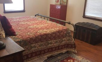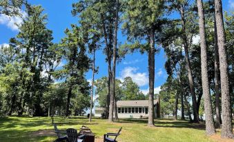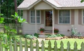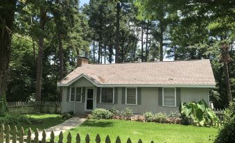 Fully furnished cottage in the woods with backyard opening to pine trees and four acre pond. Cottage has wood floors, window air conditioners and homey furnishings. Perfect for a family retreat or a romantic getaway. Located on our 50 acre working ranch, Pine Grove Cottage is tucked away on its own corner of the property with private drive and gated entrance. A sun room runs the length of the house in the back and looks out on the pine grove and lake beyond and serves as a third bedroom. An open family room/dining/kitchen is perfect for family gatherings. Guests are free to roam the ranch property which includes expanses of wooded acreage where wildlife and birds abound. Fishing on the lake is available on a "catch and release" basis to ensure fishing remains good for future guests. Lakes are stocked with bass, catfish and bream.