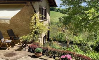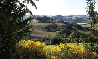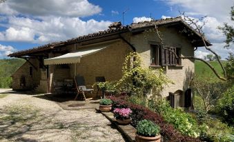 First floor self-catering flat in a charming cottage in the Marche countryside. Beautiful views and lovely fresh air. Pretty terrace for out of doors dining and relaxing. Sleeps 3 to 5 people. Well furnished. Charming fireplace. Central heating. Quiet spot. Ideal for visitors to local attractions such as Urbino, Urbania, Gubbio, San Sepolcro also for family with children who want a safe garden and friendly welcome. Away from main roads. Ideal for walkers. Romantic views. Dishwasher, washing machine, linen provided and cleaning at the end of stay included. Ideal for artists or lovers of countryside. Local shopping Urbania, good restaurants and' rosticcerie'; art and culture courses.About pets:Pets allowed.About checkOut:Check out before 11:00 AM.About children:Children allowed: ages 0-17.A cot is also available.About checkIn:Check in after 2:00 PM.About smoking:Smoking is not permitted.About minBookingAge:Minimum age to rent: 16.About events:No events allowed.