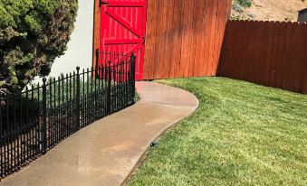 The Red Gate is an upscale studio apartment with combination lock for easy check-in. Inside are 2 large rooms, leather sofas, 65 inch TV, full kitchen with microwave/convection oven, fireplace, washer/dryer, private outside courtyard with seating area and barbecue. It sits in a lovely, quiet cul-de sac. The entire downstairs apartment is separate and totally private with no access to or from the upstairs unit.