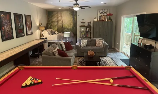 Indulge in cozy evenings by a huge gas stone fireplace in the plush living room, where a smart TV with satellite channels awaits for your evening unwind. For a touch of playful magic, venture into the game room — challenge your companions to a game of pool, flip through a curated selection of books, or select from endless classic games with a favorite beverage in hand.