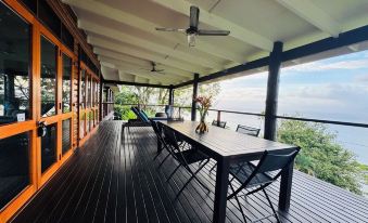Situated on a hillside overlooking the beautiful Savusavu Bay and only ten minutes from town, lies a luxurious holiday villa comprised of your very own 3 fully furnished pods joined by covered decks and a pool. The home consists of a fully equipped kitchen, living and dining areas and two bedrooms with king size beds and nice linens. Both King Suites have there own private bathroom and lush tiled shower. One of the suites/Pods is complete with a separate kitchenette.. One of the Suites/pods and the main House/Pod also have A/C. Enjoy spectacular views, sunsets and the sounds of breaking waves, amongst the surrounding gardens and fruit trees. You are located half way between Savusavu town and Jean- Michel Cousteau Resort. This home is perfect for a couple who would like to get away or have their friends join them for a holiday.