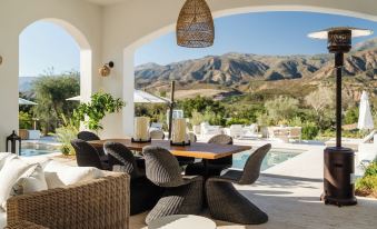 Its open layout and sophisticated ambiance invite guests to enjoy that seamlessly merges indoor and outdoor living. A fully equipped gourmet kitchen two living rooms, and a chic indoor -outdoor fireplace lounge. Everything is bright and airy. Large sliding doors open to a spacious, first floor deck that runs the length of the house, offering 180-degree views of the mountains & pool and inviting an effortless flow between indoor and outdoor living. There are 2 full living rooms one that has a beautiful fireplace with a stunning arched window displaying the Mountains & the other has the dining room connected with a 12-foot theater screen for movie nights. Mornings are best spent watching the sun grace the olives tress and endless mountain sweeps, while evenings come alive with the glow of sunset & then the Moon & Stars across the horizon.