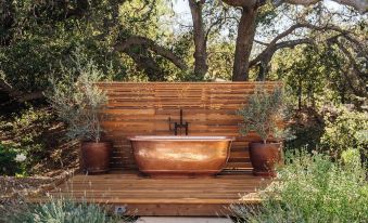 A back area behind the home with a full herb garden and a copper soaking tub.