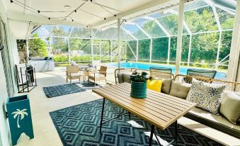☀ Fully screened in pool with fenced in backyard, outdoor dining and lounge patio