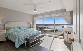 The Master features floor to ceiling windows so you can wake up to a gorgeous view of the lake, a king-sized bed, nightstands, a flat screen TV, closet, and sliding glass doors with access to the balcony. The attached bathroom features a single vanity sink and a shower/tub combo.