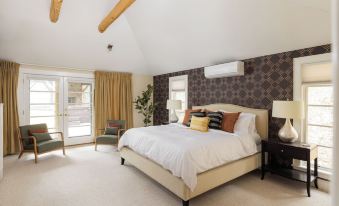 Primary Bedroom (King): Located on the main floor, this luxurious space features a king-size bed, a smart TV, a walk-in closet, vaulted ceilings, and direct access to the hot tub area.