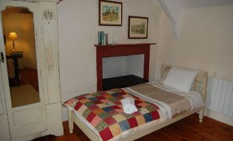 The Tudor Wing sleeps 4-5 people in two large airy oak floored bedrooms reached by a slate turret staircase, with it's original studded door. The twin bedroom has a modern ensuite shower room and toilet cleverly disguised within it. The beautiful large parlour downstairs has a big open fireplace and even a harmonium to play. The bathroom is also downstairs, as is the craftsman built kitchen with its warm quarry tiled floor.