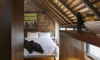 The upstairs space, is bathed in natural light and sits under the original pitched ceiling. From the stunning bedroom with its deliciously comfortable queen-size bed, step up into the open plan bathroom featuring a large wet area shower, mirrored cupboards, and gorgeous vanity all enveloped in the warmth of timber and stone. The old barn's original ladder now serves as a unique towel rack! Guest amenities are provided.