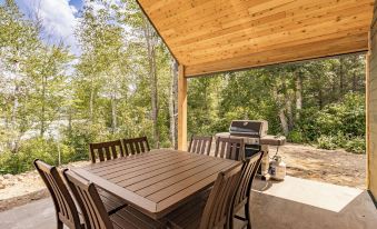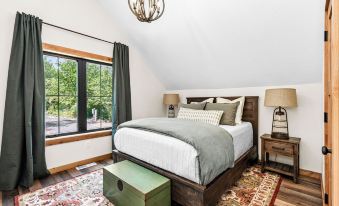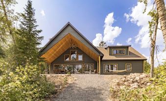 The Space: Step into a spacious, sunlit interior designed with sustainability in mind. The open-concept living area features vaulted ceilings and expansive windows that showcase breathtaking views of Wynne Lake and the surrounding forest. Relax on plush furnishings or gather around the fireplace for cozy evenings together.