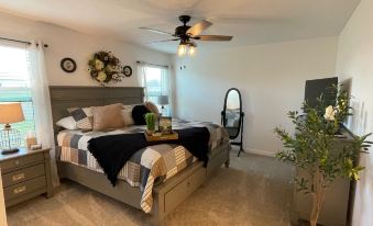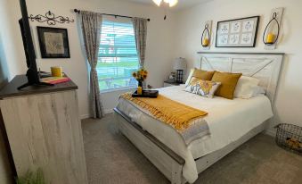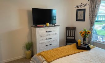 The first guest bedroom is equally inviting, with a cozy queen-size bed and a 37” smart TV to make guests feel right at home. The second guest room is thoughtfully set up as a den, offering a pull-out sofa for additional sleeping space, as well as a desk and chair for those needing a quiet spot to work or read.