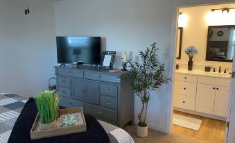 The master bedroom is a tranquil retreat, featuring a luxurious king-size bed and a 37” smart TV for private entertainment. The large walk-in closet offers plenty of space to organize your belongings, while the ensuite master bathroom boasts a double sink vanity and a walk-in shower, providing both functionality and elegance.