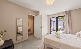 The entry door welcomes you inside and leads directly to a hallway that connects all areas. Passing the first bedroom with an ensuite bathroom on the left, you walk towards the living area featuring an open kitchen. It is equipped with a dishwasher, combi oven, induction cooktop, and wine refrigerator, connecting seamlessly with the living space, featuring beam ceilings. Wooden shutter windows above the kitchen counter offer glimpses of the scenic Spanish Water and an adjoining covered terrace suitable for dining or entertainment. The living area also has a side exit through glass sliding doors, leading to a tranquil garden with a serene spot opting for relaxation. The main bedroom, complete with an ensuite bathroom, is situated at the hallway's end. Additional glass sliding doors in the hallway and kitchen reveal a tropical courtyard garden where the remaining two bedrooms are located, each featuring ensuite bathrooms with glass sliding entry doors. All bathrooms feature stall showers and double sinks.