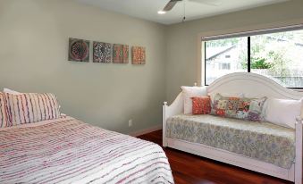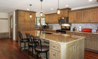 Lazy River is a beautiful property enveloped by abundant natural beauty. On one side are the majestic hills of Wimberley on the other the sheer limestone cliffs and clear waters of the Blanco River. Within this spacious family centered home is a stunning recent remodel featuring three bedrooms and two baths. A generous kitchen with high-end appliances await anyone who loves to cook. The open floor plan and bar seating ensure anyone who loves to eat front row seating. The living room is awash in lounging options arranged around the wood burning fireplace. The dining area has a six seat dining table situated under the glow of candelabra light for the gourmands in your group. The bedrooms and laundry room can be found down the hallway behind a door that can be closed for maximum privacy. The first bedroom is meant to be shared consisting of a cozy queen size bed. It has lots of natural light and views of the outdoors. The second bedroom has a queen size bed and ample closet space with plenty of natural light and views of the outdoors. The master suite has a nice king size bed with an en suite bath with neat subway tile and river rock design features. It too has lots of natural light and views of the outdoors. The shared bath is located in the hallway that compliments the master bath with granite counter tops, subway tile in the shower and lots of natural light.