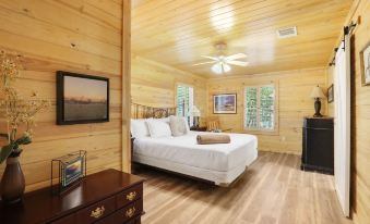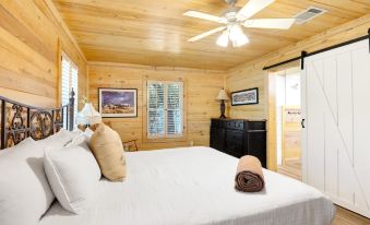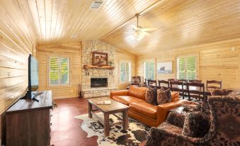 The Oak Lodge is a great space for accommodating your large group. It offers three bedrooms and two bathrooms and sleeps up to 10 people. The massive living room has plenty of seating around a gorgeous decorative fireplace. The roomy kitchen has stainless steel appliances, plenty of counter space for communal cooking, and is open to the living and dining room. One bedroom has a cushy four poster king size bed, three big windows to let in all the natural light and gorgeous Saltillo tile. The ensuite bathroom has sauna style wood paneling and walk in shower. The second bedroom has two wonderful queen beds, views of the outside, and cool to the touch Saltillo tile. This bedroom has direct access to the second bathroom which is shared with the rest of the house. This bathroom has sauna style wood paneling and extra tall tile shower. The third bedroom is in the front of the house and has two trundle beds with views of the grounds.