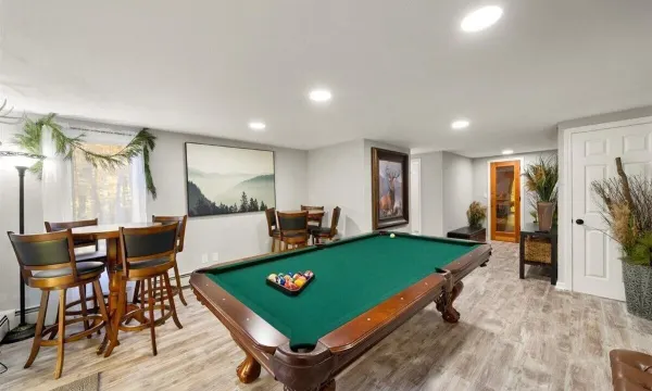 We had 9 people in 2 family units staying at house. Then about another 6 that came each night to hang out. Plenty of room. 3 living room areas for everyone to spread out. Best stocked home EVER!!! There was literally everything and anything that we needed…..and then some. Inside sauna so cool. Unfortunately way too cold to go out and enjoy the hot tub. Decorations beyond beautiful. Owner very quick with communication. Highly recommend staying here.
