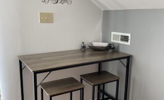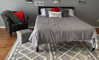 This space is a cozy studio apartment that is fully furnished with a queen size bed, sitting chair and bar table. There is a full bathroom with a standup shower and a kitchenette area for cooking and storing food.