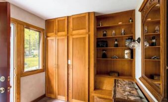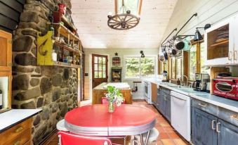 The house has two bedrooms (a primary bedroom with a bathroom) and a loft bedroom (with views of Overlook Mountain) up a staircase on the other side of the house. The stair could be tricky for very young children.