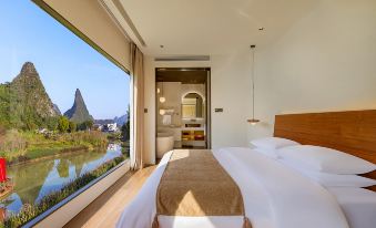 The hotel is located in Xingping Town, Yangshuo County, Guilin City, Guangxi, China. It is adjacent to the most beautiful section of the Lijiang River and backed by the iconic landscapes of the Lijiang River, such as the Nine-Horse Fresco Hill and the Huangbu Reflection, which is the "scenery on the back of the 20-yuan RMB note". When the weather is sunny, the water and the sky merge into one color, and the mountain scenery is reflected in the water. Walking among them, people seem to be strolling in the clouds. Even in rainy weather, the scenery here has a unique charm. The misty rain adds a bit of the softness and poetry of the water towns in the south of the Yangtze River.
