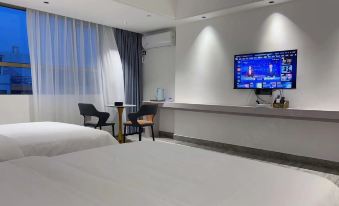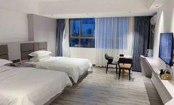 春節返程路上堵車過渡,樓下就有早餐店,靠近路邊稍微有點吵,房間很大,雙床房1米5的床很贊,推薦入住