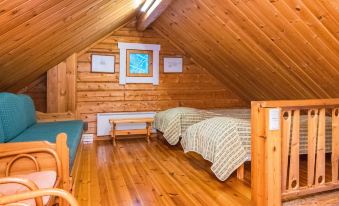 A log cabin, built in 1999, features a living room/kitchen (kitchen renovated in 2008). The bedroom has two beds joined together; the owner can separate them upon request. The loft has three box spring beds.