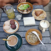 La colazione nel nostro caso era inclusa, si tratta di colazione cinese, salata con noodles, riso, uova, verdure e tè.