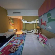 Very children friendly. Cute amenities. Friendly staff and generous service. Allowing for early check in and late checkout until 2pm because we have 2 kids and 2 elderly in the group. Very considerate. Delicious food. Some hiccups when retrieving the luggage after checkout. They only accepted local mobile number and even the porter marked the number wrongly resulted a lot of delays and inconvenience. If you have a kid slightly above 1m even 1.01m height will not be tolerated for any entry ticket and meal.