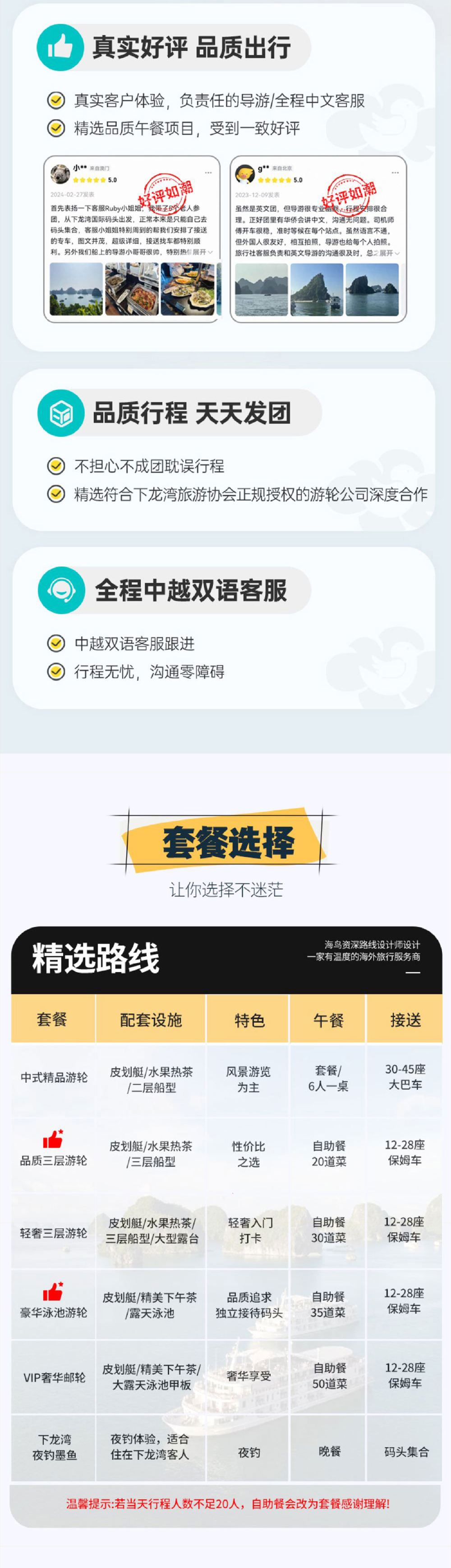 Attenzione!! Tranne che per le crociere di lusso in stile cinese, se il numero di partecipanti agli altri pacchetti non raggiunge le 20 persone nello stesso giorno, il buffet verrà sostituito con un pacchetto. Ci scusiamo per l'inconveniente.