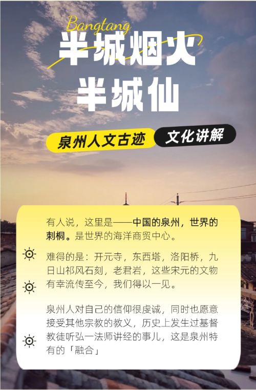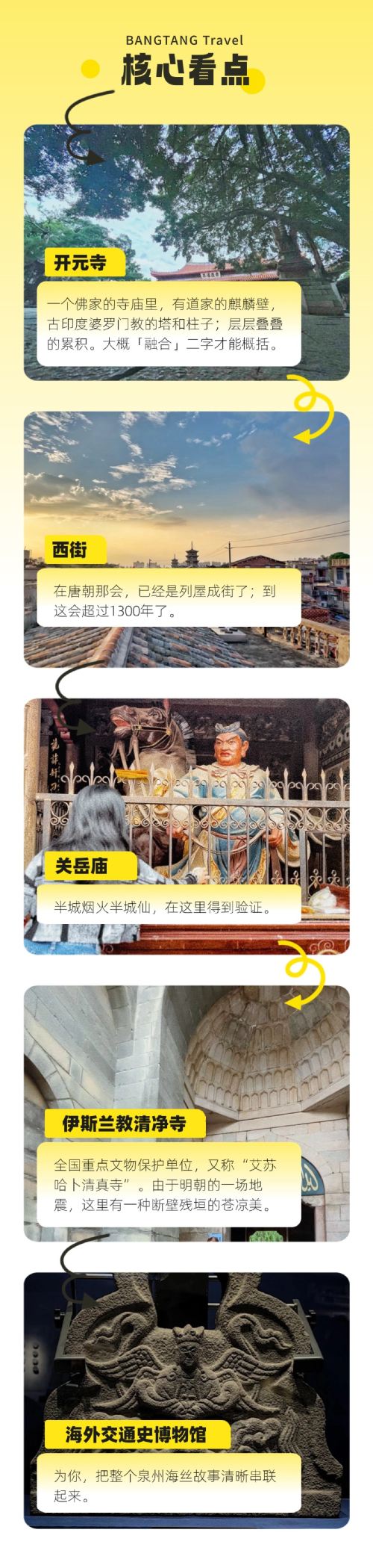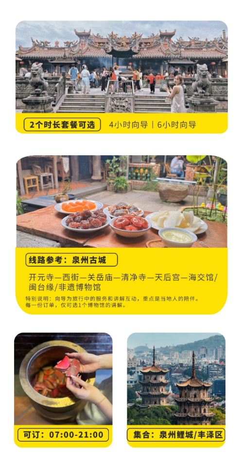 [Visita guida 4 ore] È possibile scegliere tra il Tempio Kaiyuan, il Museo Marittimo, il Museo delle Relazioni Fujian-Taiwan o il Museo del Patrimonio Culturale Immateriale. Altre attrazioni includono West Street, il Tempio Guanyu, la Moschea Qingjing, il Tempio Tianhou, il Ponte Luoyang e il Monte Qingyuan.