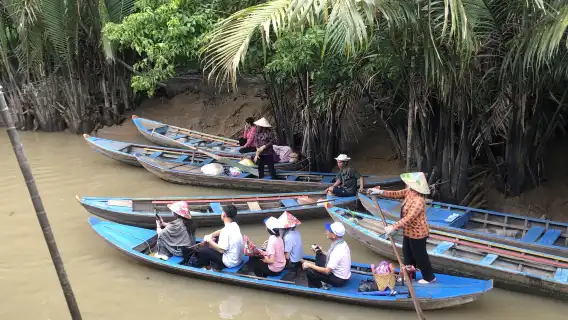 Gustate un autentico pranzo vietnamita, esplorate la foresta di palme da cocco del Mekong con una caratteristica crociera locale e assaporate frutta fresca del posto, tè al miele, dolci come lo zucchero di cocco e altre prelibatezze.