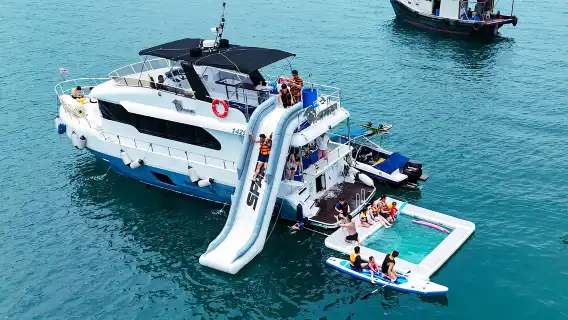 Noleggio yacht Sai Kung, Hong Kong: yacht da 55 piedi (consigliato per 5-15 persone) con pranzo gratuito, scivolo marino, giro in banana boat e giro in motoscafo. Disponibile a Half Moon Bay, Nanfeng Bay e altre destinazioni Sai Kung.