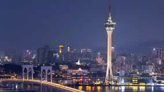Goditi la vista panoramica del paesaggio notturno di Macau dalla penisola, con le sue luci scintillanti che si estendono a perdita d'occhio!