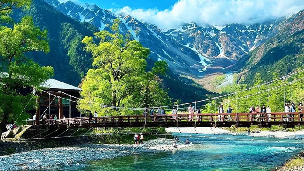 ▲ Il ponte Kappa è un'attrazione simbolica di Kamikochi, raggiungibile a piedi in 5 minuti dal centro bus. Dal ponte si può ammirare la catena montuosa Hotaka, il monte Yake e le acque del fiume Azusa. Durante le vacanze di maggio, l'estate e la stagione autunnale dei colori, attira numerosi turisti sia giapponesi che internazionali.